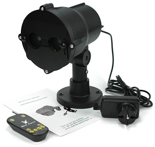 Аппарат имеет 2 излучателя, которые генерируют лазерные лучи красного и зеленого цветов. Хаотически перемещаясь, лучи многократно отражаются от любых поверхностей: пола, земли, стен, заборов и т.п., образуя своеобразную световую картину, которая постоянно изменяется. Для птиц красный и зеленый свет — это сигнал опасности. К тому же, яркие лучи лазера, попадая в глаза, вызывают болевые ощущения и тем самым усиливают чувство паники у пернатых. Ни одна птица не сможет выдержать такого воздействия и будет вынуждена покинуть ваш объект или территорию. Подобные лазерные установки для отпугивания птиц часто используются на больших фермах, в аэропортах, колхозах, зернохранилищах и т.д.